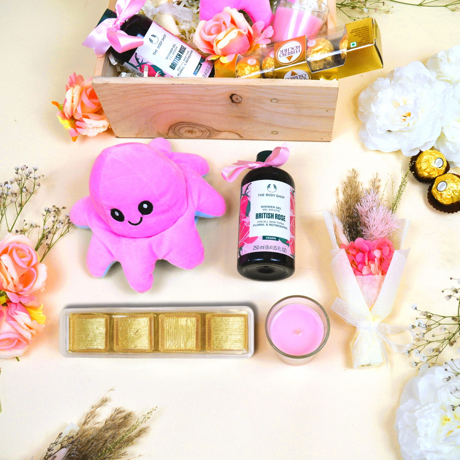 Celebrate in luxury with our premium gift hamper featuring the latest must-haves for ultimate pampering. Our set includes a mood plush toy to bring comfort and joy, a dried flower bouquet to add a touch of nature to your decor, The Body Shop shower gel for a revitalizing shower experience, a scented candle to create a relaxing ambiance and handmade chocolates for a sweet treat. Ideal for Valentine Day, birthdays, anniversaries, or just to spoil her, this gift hamper is the perfect way to treat their mind, body, and soul.